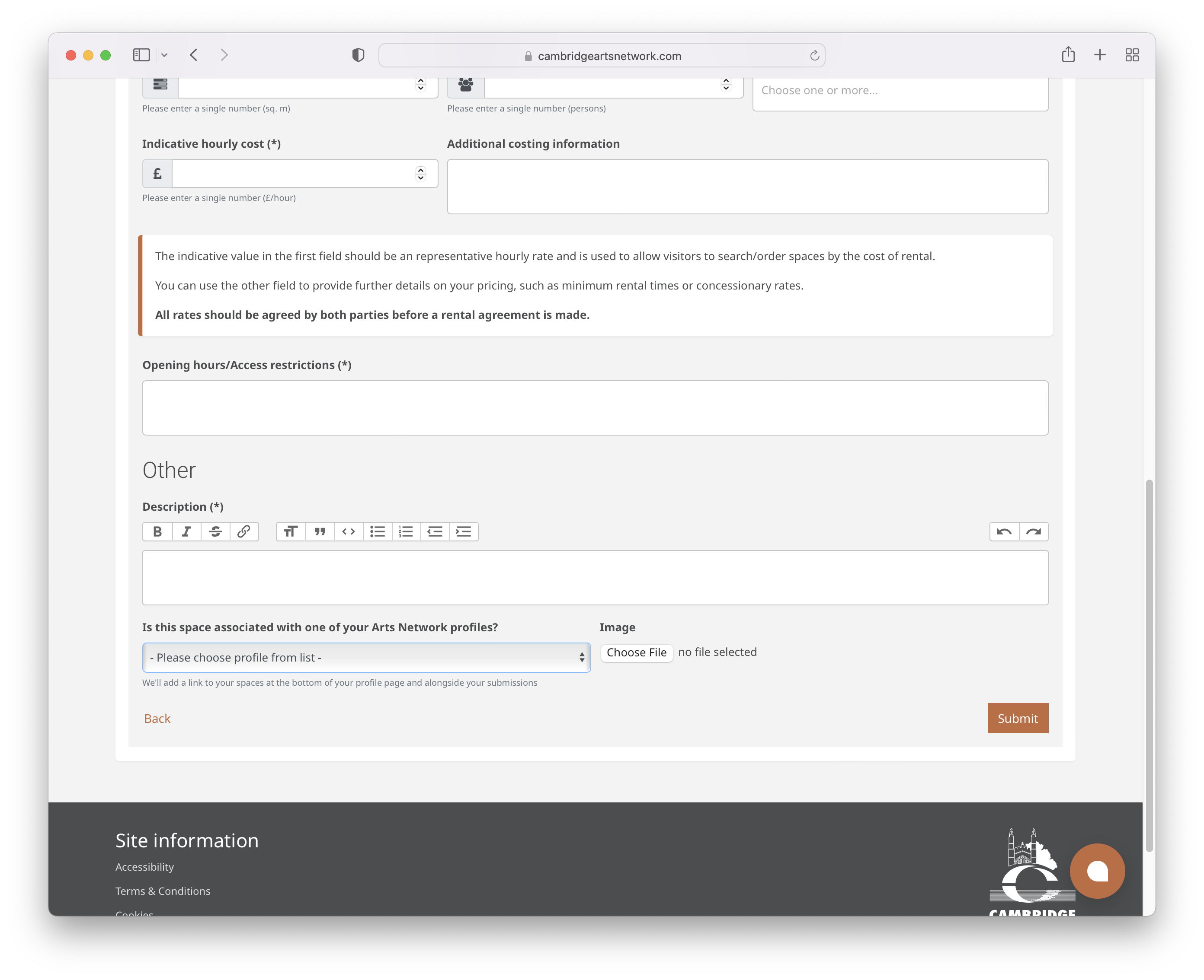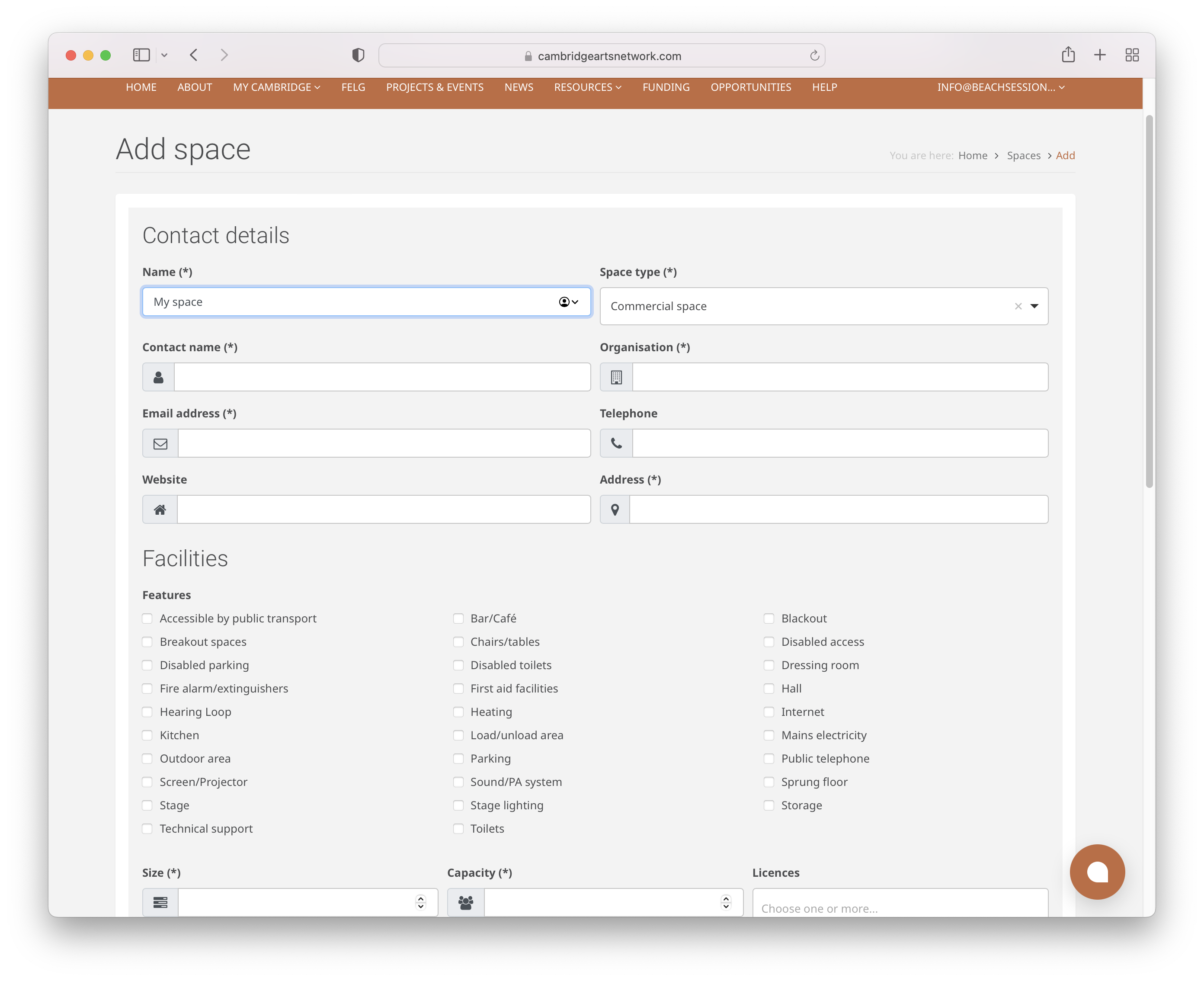 This will bring you to the Spaces form, where you can tell us about your space, the facilities it offers and the cost to hire it.