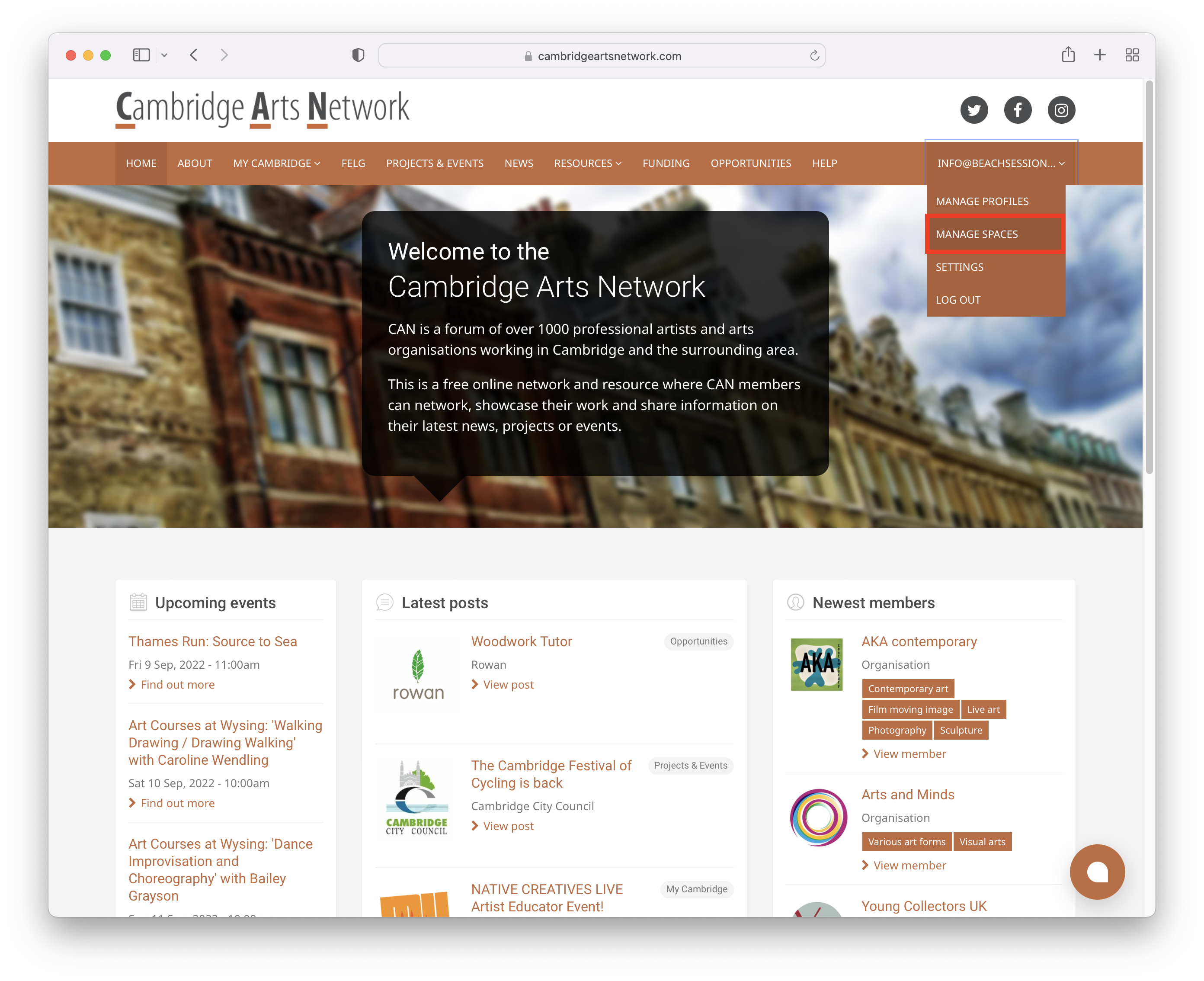 To submit content, you first need to register for a user account on CAN and then log in to the site. You do not need to create a profile for yourself or your organisation, though if your space is owned by an organisation that you manage on CAN, you can include a link to it's profile later on.