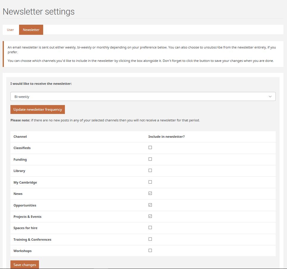You'll then see the 'Newsletter Settings' page. You can select the frequency of your newsletter and the content you'd like to read.